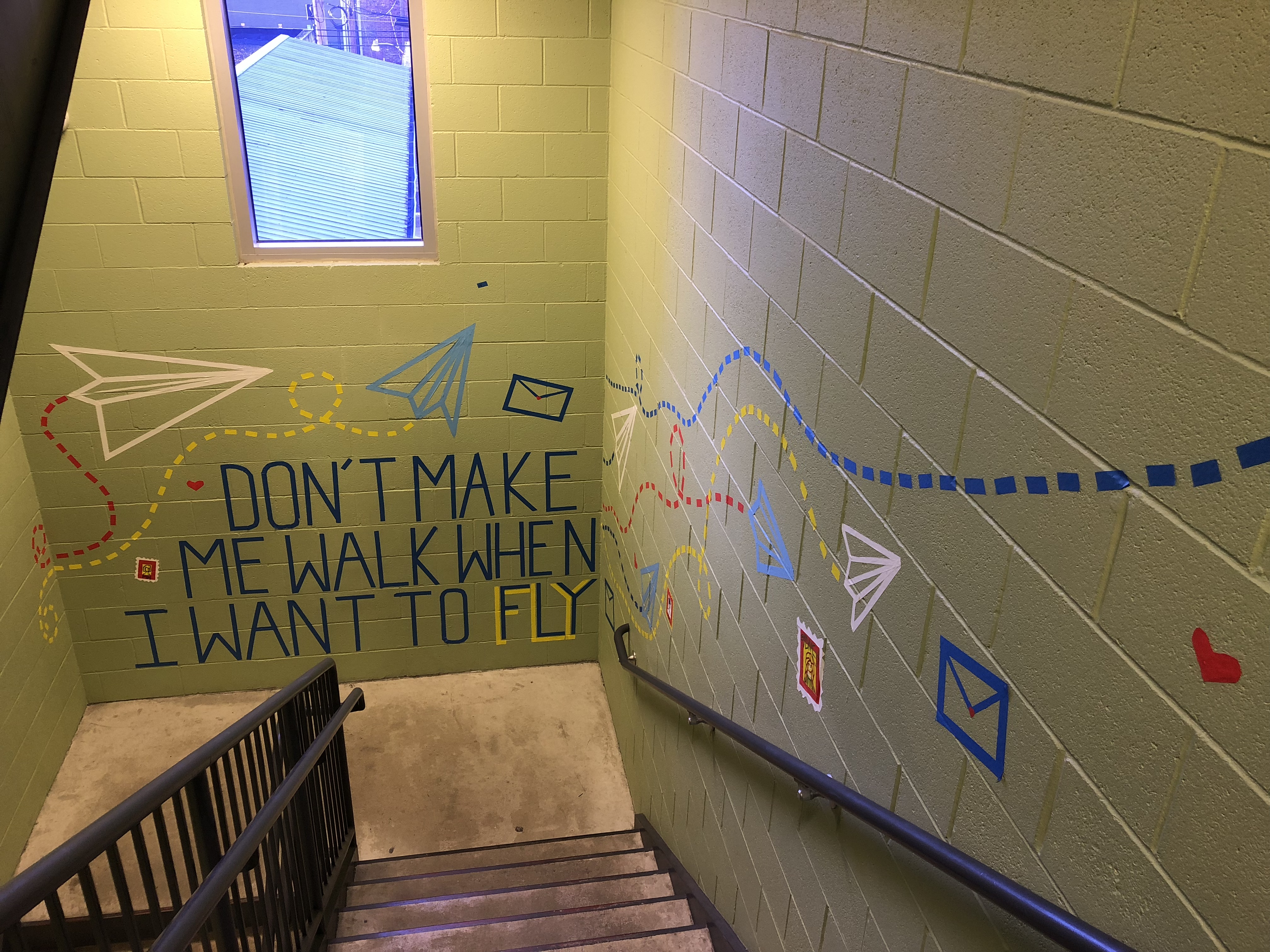A student-decorated stairway at Barbara Ingram School for the Arts.