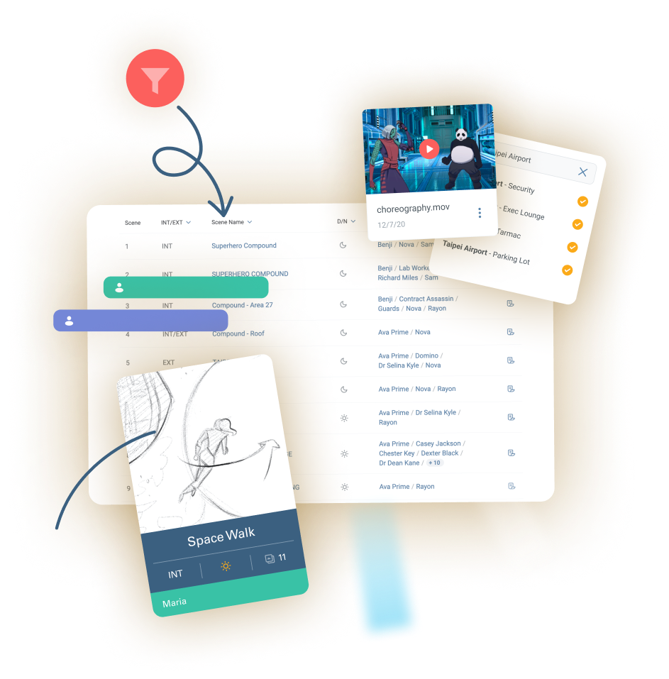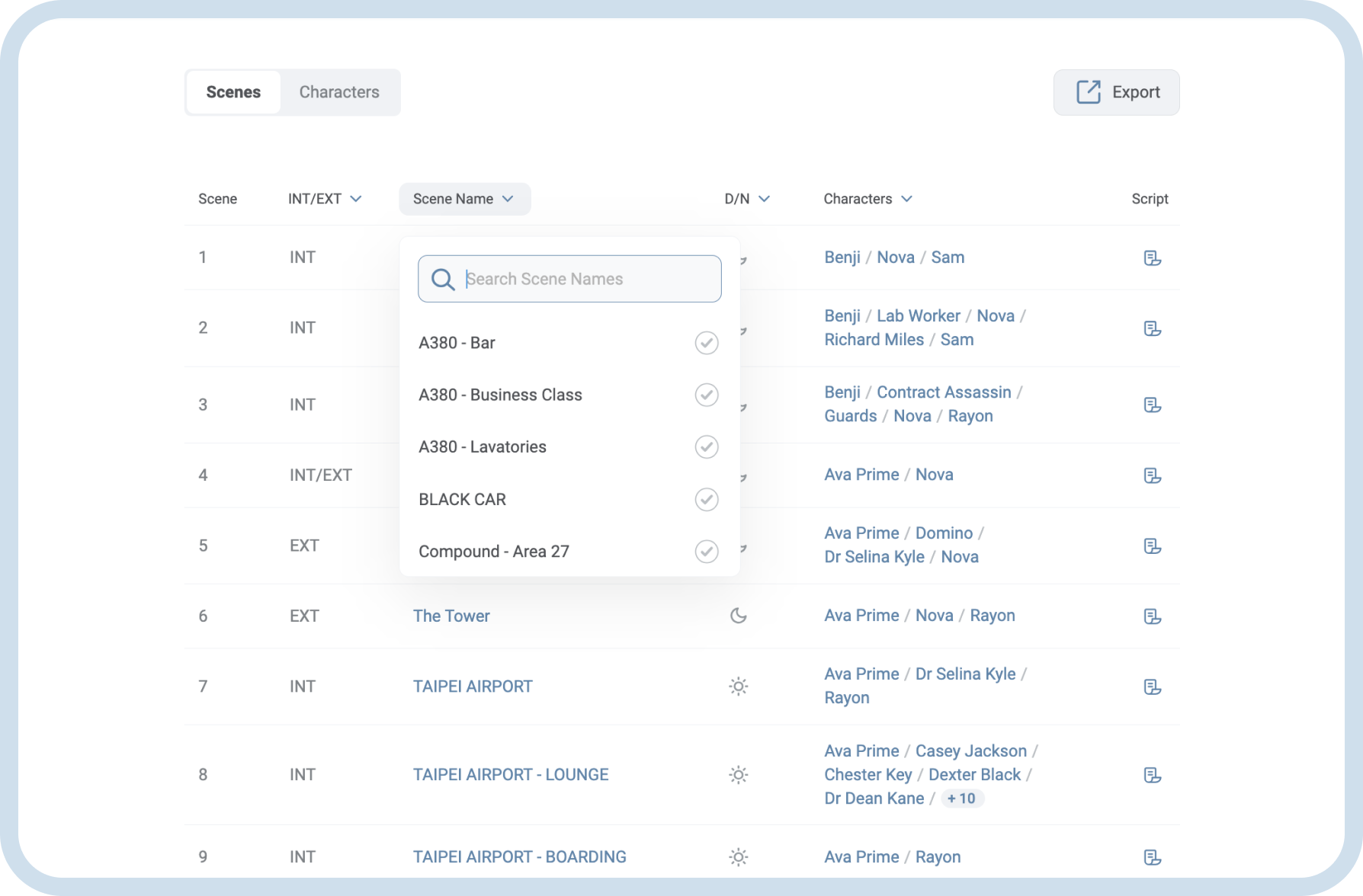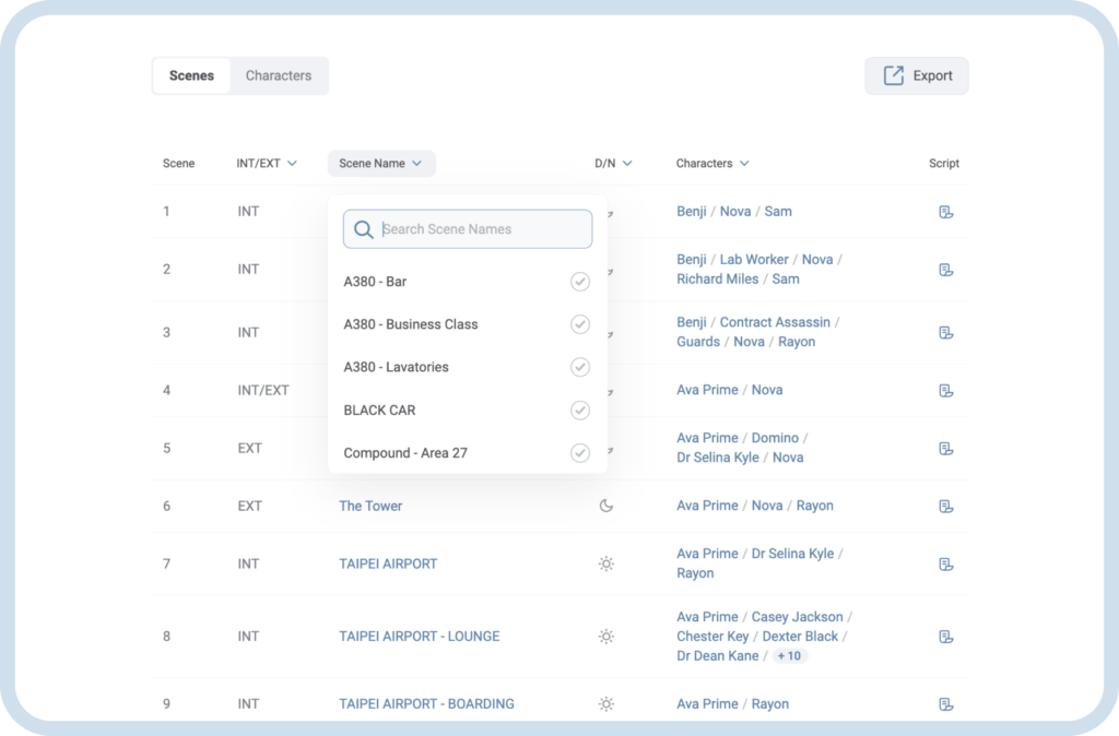 Effortlessly sift through scenes, characters, and sets using intuitive filters, allowing you to focus on the most relevant information for your department.